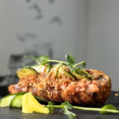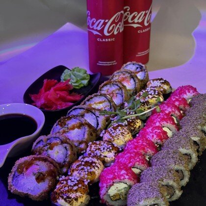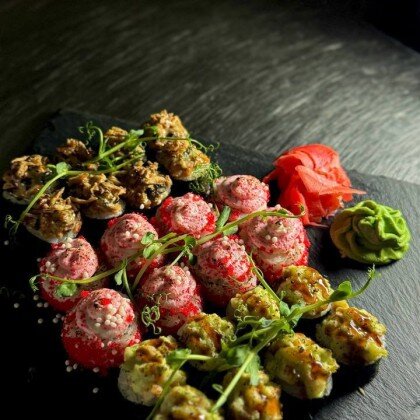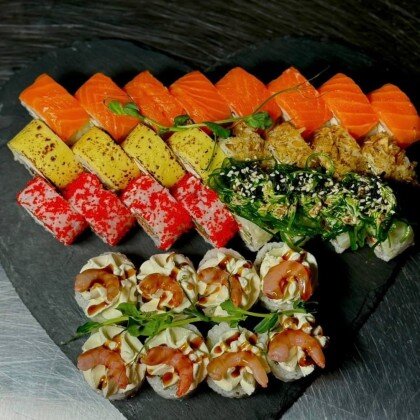 Рис,нори,сыр,сухари панко,тепурная смесь,имитация краба,авокадо,спайси соус карамельный лук