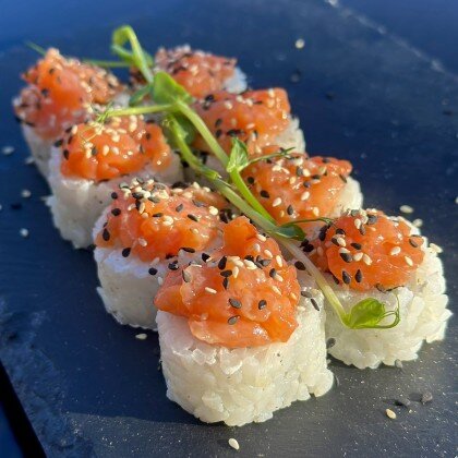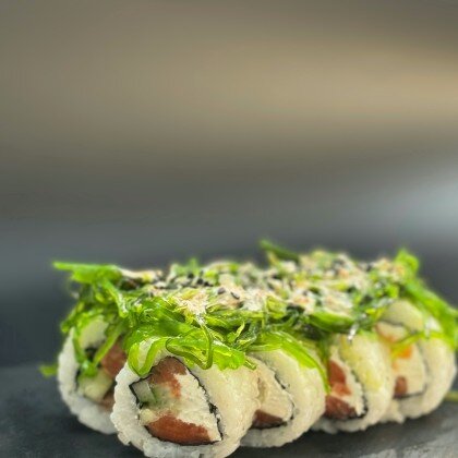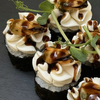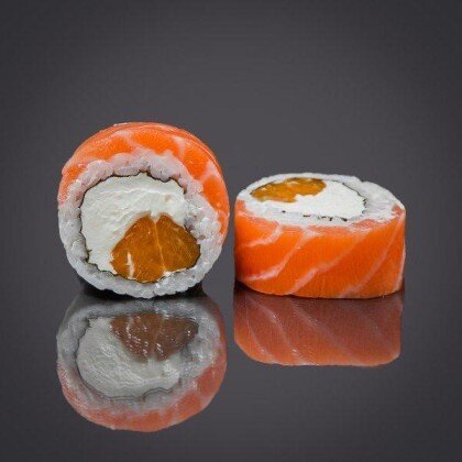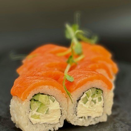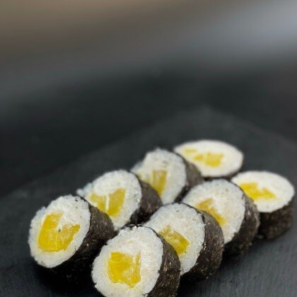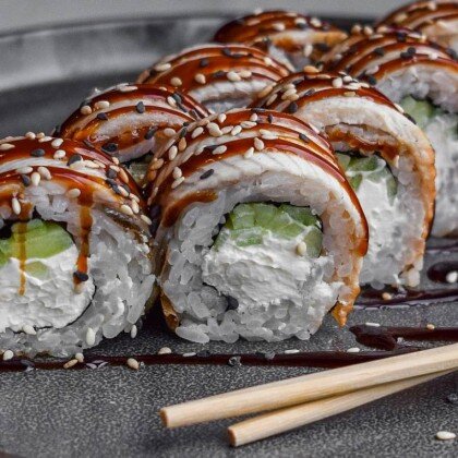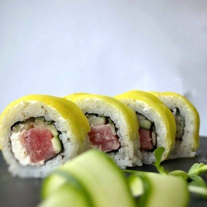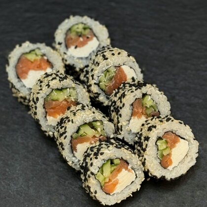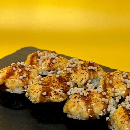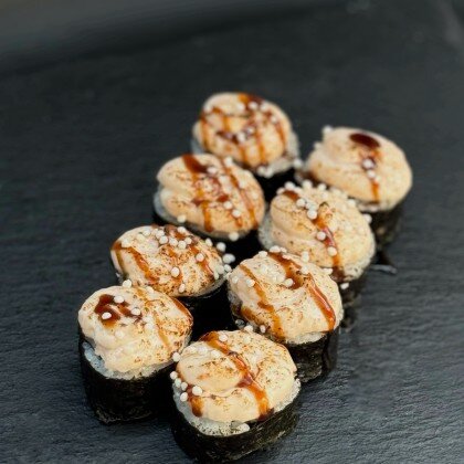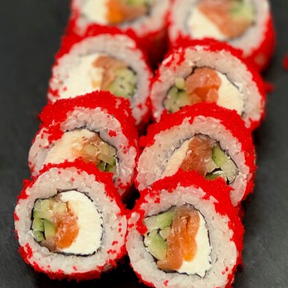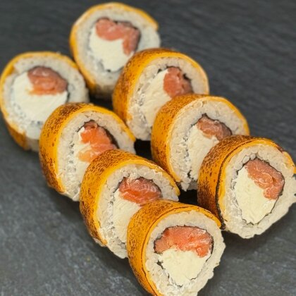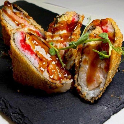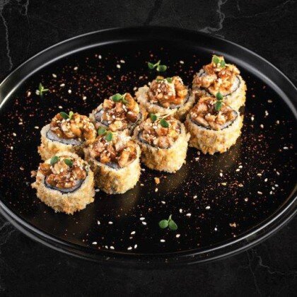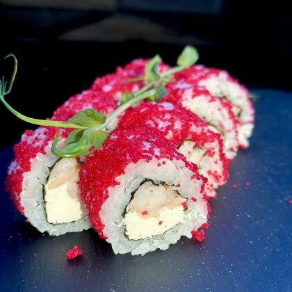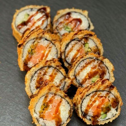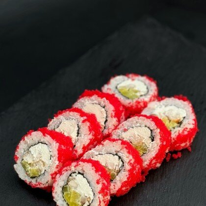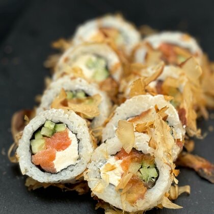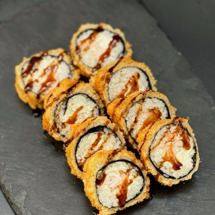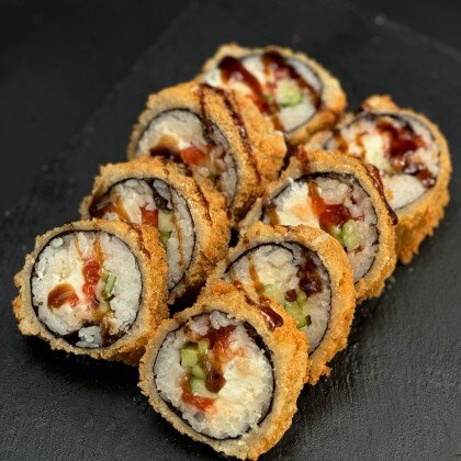 Рис, нори, сыр, бекон, огурец, альгуминовая икра, темпура, панко